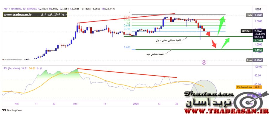 در تصویر شماره سه ( تصویر بالا ) چارت ریپل را در تایم فریم روزانه مشاهده می فرمایید . همانطور که به خوبی مشخص است شاهد واگرایی منفی در اندیکاتور RSI هستیم که موجب ریزش قیمتی شده است . آر اس آی هنوز در بالای ناحیه اشباع 30 قرار دارد و به سمت این ناحیه در حرکت است و با ورود به ناحیه اشباع ، روند ریزش میتواند سریعتر حرکت نماید . در الگوی قیمت نیز ، با دو ناحیه حمایتی روبرو هستیم . ناحیه حمایتی اول که محدوده 100 فیبو ناچی و خط حمایتی در محدوده قیمتی 2.0101 دلار است و باید منتظر واکنش کندلها پس از برخورد به این ناحیه باشیم که در صورت شکسته شدن این ناحیه ، نقطه حمایتی بعدی فیبوی 161.8 درصد فیبوناچی می باشد که در قیمت 1.1556 دلار می باشد که از نقطه فعلی حدود 50 درصد پایینتر است و موجب ریزش عمیق قیمت می گردد و ریپل را با خطر سقوط به زیر 1 دلار مواجه می کند . برای بررسی بهتر روند ، میبایست ادامه تحلیل را بر روی تصویر نهایی انجام دهم .