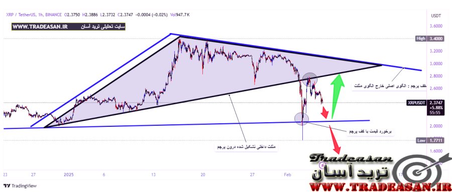در بالا نمودار ریپل را در تایم فریم یک ساعته مشاهده می کنید . همانطوری که به خوبی پیداست ، قیمت درون یک الگوی پرچم قرار دارد ولی درون الگوی پرچم نیز شاهد مثلثی هستیم که به طور کامل شکل گرفته و نتیجه داده است. قیمت ناگذیر از کف مثلث به پایین حرکت کرده و با توجه به سرعت حرکتی که چارت در چنین مواقعی به خود می گیرد ، بشدت با کف الگوی پرچم برخورد نموده است و پس از برخورد به کف پرچم ، شاهد بازگشت قیمت در همان کندل بوده ایم به طوریکه کندلی با شدوی بسیار بلند در پایین خود تشکیل داده است . سپس به مانند قوانین الگوی کلاسیک پرچم ( قیمت پس از شکستن سقف یا کف ، به سرعت به همان نقطه شکست پولبک می زند ) مجددا به سمت نقطه ای که از آن خارج شده ، حرکت کرده است و رشد کوچکی را تجربه کرده ایم . قیمت مجددا با برخورد به آن ناحیه و ناتوانی از ورود مجدد به داخل مثلث ، اکنون به سمت کف پرچم در حرکت است . البته این پایان کار برای ریپل نیست . چرا که هنوز قیمت درون پرچم قرار دارد و تا زمانیکه درون پرچم قرار داشته باشد ، جایی برای نگرانی نیست و میتوان انتظار تغییر روند را داشت . قیمت میتواند به کف پرچم برخورد کند ولی مجدد و حتی برای بار چندم ، حمایت شده و با رشد همراه شود . ولی چنانچه کف پرچم نتواند جلوی ریزش قیمت را بگیرد ، آن زمان است که باید منتظر ریزش عمیقی در ریپل باشیم .