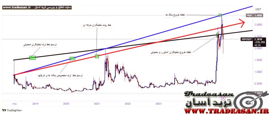 ولی شرکتهای بسیار بزرگ میلیارد دلاری و یا هولدرهای بزرگ ، چگونه به روند نگاه می کنند ؟ شما اگر یک بنگاه بزرگ مالی را اداه می کردید و یا اگر مانند او فکر می کردید ، خط روند آبی را رسم می کردید . شما صبور هستید . شکارچی ماهری هم هستید . شما آنقدر حریص ( از نگاه مثبت ) هستید که حتی بسیاری مواقع به طعمه خود غذا می دهید . شما نمیخواهید شکاری لاغر را بدست بیاروید . شما مالک روند هستید . در این چارت ، شما در محدوده اول و دوم یعنی نقاط سیاه و قرمز ( که نزدیک هم هستند ولی طوری رسم کردم که اندکی فاصله داشته باشند تا بتوانم مبحث را باز کنم ) تمام آنچه هولدرهای کوچکتر و ریزتر و خردتر میفروشند را میخرید برای اندک زمانی به آنها سود میرسانید و آنها حریص تر ( از نوع منفی ) میشوند . آنها تصور می کنند که پیروز شده اند ولی نمی دانند که هنوز در دام شما گرفتار هستند . قیمت اندکی افت می کند و شما منتظر هستید تا در نزدیکترین ناحیه حمایتی ، بازی اصلی خود را کامل کنید . به عنوان نمونه : قیمت در این چارت با برخورد به ناحیه حمایتی کم اثر ( ولی بنگاه ها به دنبال همین نواحی هستند ) شروع به خرید بزرگتر می کنید و پوزیشن بای جدیدی را بر روی قبلی باز می کنید . تریدرهای کم تجربه و هولدرهای کوچک و خرد ، مجددا وارد می شوند ولی هنوز محتاط هستند . قیمت بالا میرود و اینبار طبق برنامه بنگاه های بزرگ ، سقف مقاومتی قبلی که اکنون بسیار قویتر نیز به چشم میرسد شکسته میشود و اکنون طعمه گرفتار می شود . کثیری از هولدرهای خرد و تحلیلگران کم تجربه ، که چند روز قبل ، همین ناحیه را ناحیه خروج و فرار می دانستند ، اکنون ناحیه ای برای کسب ثروت و رسیدن به قله های بزرگتر می دانند . در این هنگام است که سیل اخبار مثبت وارد بازار میشود . ریپل به زودی 10 دلار را فتح می کند . قله بعدی 5 دلار و سپس بالاتر و 20 دلار و بالاتر و شما میپندارید که چرا این فرصت را باید از دست داد ؟ تحلیل که دروغ نمی گوید . وقتی سقف مقاومتی شکسته شود ، پس از یک پولبک ، روند و موجی جدید را آغاز می کند پس هنگامه سل گرفتن نیست باید خرید یا بای گرفت . بمانند نمونه در همین تصویر بالا ، قیمت ریپل پس از شکسته شدن سقف قبلی در محدوده 2.8 دلاری به بالا در حرکت است ولی با برخورد به خط روند بزرگان بازار در محدوده 3.4 دلاری در ناباوری با ریزش بزرگی همراه می شود و نکته جالب اینجاست که ( ادعا نیست موثق پرس و جو کرده ام ) بسیاری از کسانیکه ریپل را خرید و فروش می کنند ، با بخش اعظم سرمایه خود در محدوده بالای 3 دلار وارد ریپل شده اند و حتی در ناحیه 2.8 دلار با فرض بر اینکه این بازگشتی پولبک وار هست ، مجدد خرید کرده اند و تریدرها نیز نه تنها پوزیشن buy را حفظ کرده اند بلکه پوزیشن جدیدی در 2.8 باز کرده اند که بسیاری از آنها توسط همین بنگاه های بزرگ ، بلعیده شده است و در خوشبینانه ترین حالت حد ضرر تریدرها فعال شده ( اگر حد ضرری را تصور می کردند ) .