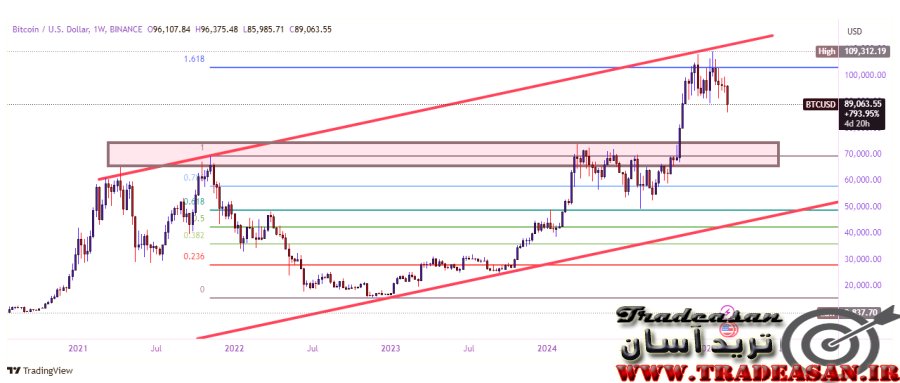 در نمودار هفتگی (تصویر شماره یک)، روند بیت کوین همچنان صعودی است و در تایم فریم بلندمدت هدف بالقوه‌ای در محدوده 109,000 دلار دارد. قیمت تاکنون دو مرتبه به خط روند بلندمدت که مؤسسات مالی و بانک‌های بزرگ آن را مدنظر دارند، برخورد کرده است. (برای جزئیات بیشتر درباره نحوه رسم این خطوط از دیدگاه مؤسسات مالی، به تحلیل‌های پیشین مراجعه کنید.)