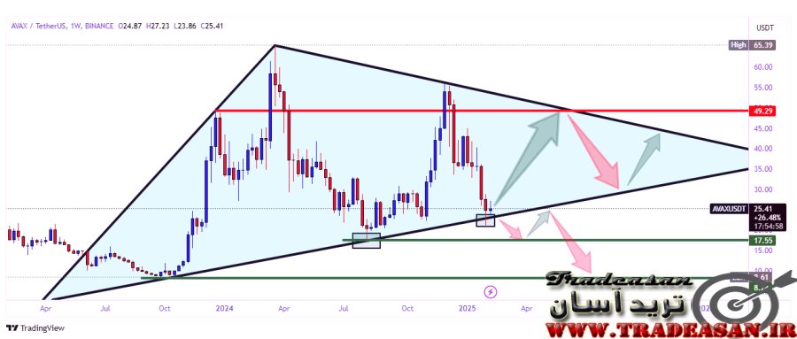 در تصویر شماره 4 روند رمز ارز آوالانچ ( Avax ) را در تایم فریم 1 ساعته بررسی کرده ایم و به انتهای روند ( کندل صعودی هفتگی ) پرداخته ایم . مشاهده می فرمایید که روند درون یک کانال کم شیب صعودی در حرکت است و اکنون به کف کانال برخورد نموده و انتظار می رود مجددا روندی صعودی حداقل تا سقف کانال را آغاز نماید و قیمت تا 27.23 دلار رشد نماید . همچنین محتمل است که قیمت ناتوان از صعود بوده و به پایین کانال هدایت شود و ریزشی تا 23.68 دلاری را شاهد باشیم . توجه داشته باشید که روند هنوز درون همان مثلث بزرگ و کوچک است و این روند ، بیشتر جهت ترید بکار می رود و یا خریدهایی با سود لحظه ای و کوتاه . لذا اگر قصد ترید دارید می توانید در محدوده کنونی 25.46 پوزیشن Buy با هدف قیمتی 27.23 دلار داشته باشید و مجددا در همان ناحیه پوزیشن sell تا کف کانال و یا میتوانید صبر کنید و با مشاهده قیمت به زیر 25 دلار در محدوده 24.50 دلاری ( پس از تثبیت ) پوزیشن Sell با هدف 23.68 دلار داشته باشیم . حال مجددا به ادامه روند بلند مدت حداقل 3 ماهه آوالانچ می پردازیم .