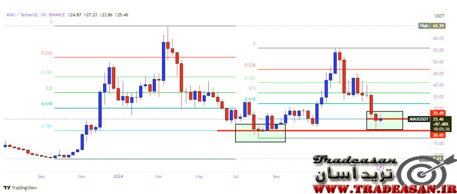 در تصویر بالا ( شماره 1 ) چارت هفتگی AVAX را مشاهده میفرمایید . در نگاه اول ، اصل اول و بنیادی و اساسی تحلیل تکنیکال را در چارت این رمز ارز مشاهده می کنیم ( در تحلیل تکنیکال ، تاریخ تکرار می شود ) مشاهده می فرمایید که قیمت در اکتبر 2023 از محدوده 8.61 دلاری ، روند صعودی را آغاز نمود که در تاریخ مارس 2024 به قیمت 65.39 دلاری دست یافت . این محدوده با فیبو ناچی اول ، مشخص شده است . جالب آنست که پس از آن قیمت ریزش نمود و مجددا در اکتبر 2024 با برخورد به فیبوی 0.78 درصد ، روند نزولی را پایان داده و شیب صعودی را تکرار کرد که اینبار قیمت از محدوده 17 دلاری تا 56 دلار رشد نمود و مجددا در این محدوده وارد اصلاح شد که همینک نیز ادامه دارد و قیمت در محدوده 25.46 دلاری قرار دارد و بیش از 50 درصد ریزش یا اصلاح نموده است . حال اگر مجددا فیبویی از ناحیه 17 دلاری تا قله 56 دلاری رسم کنیم ، میتوانیم احتمالات تاثیر گذاری نقاط فیبو را مشخص نماییم . همانطور که می بینید ، قیمت پس از برخورد به فیبوی 0.78 درصد ( به مانند مرحله قبل ) همینک کندلی صعودی را تشکیل داده است . البته با توجه به اینکه هنوز در مرحله اتمام اصلاح نیستیم ، نمی توانیم با اطمینان بگوییم که به مانند قبل ، در این نقطه نیز شاهد ورود خریداران بزرگ باشیم و رشد دوباره ای را مشاهده کنیم ولی میتوانیم این ناجیه را به عنوان ناحیه تاریخی و تاثیر گذار ، مد نظر قرار دهیم . حال برای آنکه بتوانیم روند کنونی را بهتر تحلیل کنیم ، به تصویر بعدی رجوع می کنیم .