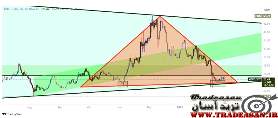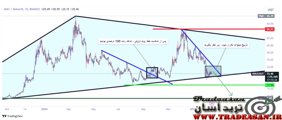 در تصویر بالا ( شماره 1 ) چارت هفتگی AVAX را مشاهده میفرمایید . در نگاه اول ، اصل اول و بنیادی و اساسی تحلیل تکنیکال را در چارت این رمز ارز مشاهده می کنیم ( در تحلیل تکنیکال ، تاریخ تکرار می شود ) مشاهده می فرمایید که قیمت در اکتبر 2023 از محدوده 8.61 دلاری ، روند صعودی را آغاز نمود که در تاریخ مارس 2024 به قیمت 65.39 دلاری دست یافت . این محدوده با فیبو ناچی اول ، مشخص شده است . جالب آنست که پس از آن قیمت ریزش نمود و مجددا در اکتبر 2024 با برخورد به فیبوی 0.78 درصد ، روند نزولی را پایان داده و شیب صعودی را تکرار کرد که اینبار قیمت از محدوده 17 دلاری تا 56 دلار رشد نمود و مجددا در این محدوده وارد اصلاح شد که همینک نیز ادامه دارد و قیمت در محدوده 25.46 دلاری قرار دارد و بیش از 50 درصد ریزش یا اصلاح نموده است . حال اگر مجددا فیبویی از ناحیه 17 دلاری تا قله 56 دلاری رسم کنیم ، میتوانیم احتمالات تاثیر گذاری نقاط فیبو را مشخص نماییم . همانطور که می بینید ، قیمت پس از برخورد به فیبوی 0.78 درصد ( به مانند مرحله قبل ) همینک کندلی صعودی را تشکیل داده است . البته با توجه به اینکه هنوز در مرحله اتمام اصلاح نیستیم ، نمی توانیم با اطمینان بگوییم که به مانند قبل ، در این نقطه نیز شاهد ورود خریداران بزرگ باشیم و رشد دوباره ای را مشاهده کنیم ولی میتوانیم این ناجیه را به عنوان ناحیه تاریخی و تاثیر گذار ، مد نظر قرار دهیم . حال برای آنکه بتوانیم روند کنونی را بهتر تحلیل کنیم ، به تصویر بعدی رجوع می کنیم .