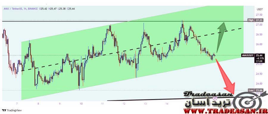 در تصویر شماره 4 روند رمز ارز آوالانچ ( Avax ) را در تایم فریم 1 ساعته بررسی کرده ایم و به انتهای روند ( کندل صعودی هفتگی ) پرداخته ایم . مشاهده می فرمایید که روند درون یک کانال کم شیب صعودی در حرکت است و اکنون به کف کانال برخورد نموده و انتظار می رود مجددا روندی صعودی حداقل تا سقف کانال را آغاز نماید و قیمت تا 27.23 دلار رشد نماید . همچنین محتمل است که قیمت ناتوان از صعود بوده و به پایین کانال هدایت شود و ریزشی تا 23.68 دلاری را شاهد باشیم . توجه داشته باشید که روند هنوز درون همان مثلث بزرگ و کوچک است و این روند ، بیشتر جهت ترید بکار می رود و یا خریدهایی با سود لحظه ای و کوتاه . لذا اگر قصد ترید دارید می توانید در محدوده کنونی 25.46 پوزیشن Buy با هدف قیمتی 27.23 دلار داشته باشید و مجددا در همان ناحیه پوزیشن sell تا کف کانال و یا میتوانید صبر کنید و با مشاهده قیمت به زیر 25 دلار در محدوده 24.50 دلاری ( پس از تثبیت ) پوزیشن Sell با هدف 23.68 دلار داشته باشیم . حال مجددا به ادامه روند بلند مدت حداقل 3 ماهه آوالانچ می پردازیم .